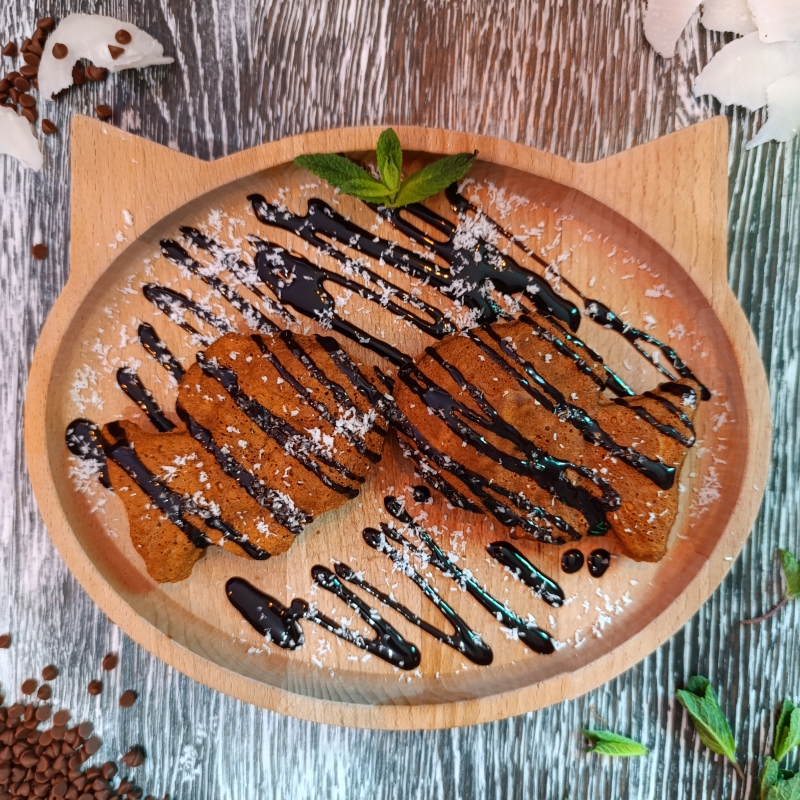 две маленькие рыбки тайяки из вафельного теста, с нутеллой и бананом внутри, подаются с мороженым, топпингом и кокосовой стружкой