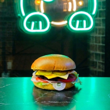 фирменная говяжья котлета, сыр чеддер, лук красный, салат, огурец соленый, соус шрирача, соус сырный