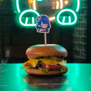 фирменная говяжья котлета, бекон жареный, сыр чеддер двойной, салат, помидор, огурец соленый, лук красный, соус bbq, горчица