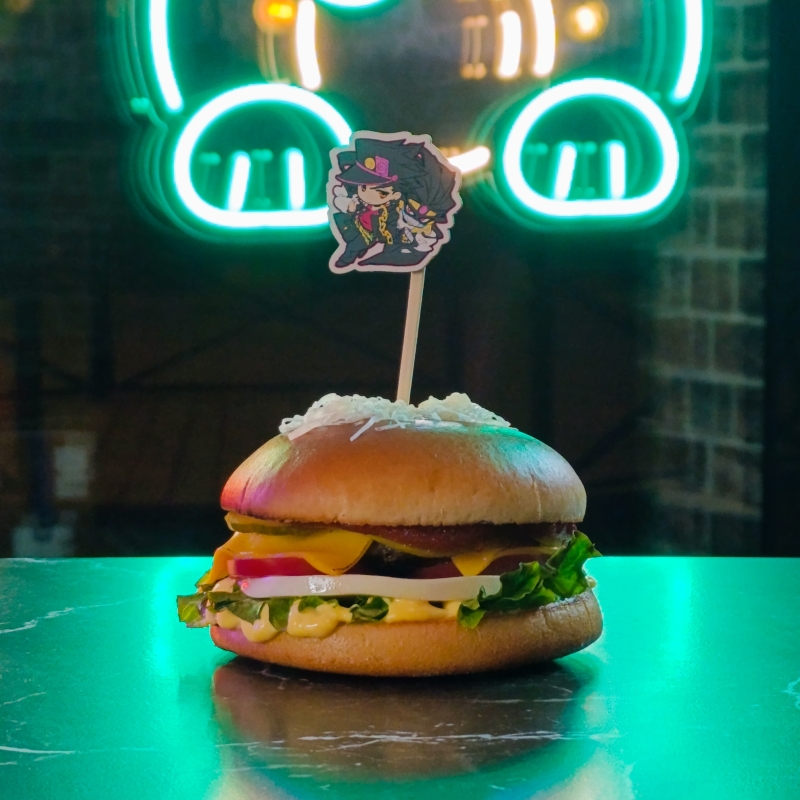фирменная говяжья котлета, сыр чеддер двойной, сыр сулугуни, пармезан, помидор, огурец соленый, салат, соус сырный, кетчуп