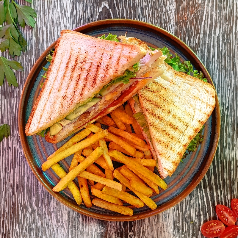 2 фирменные говяжьи котлеты, сыр чеддер двойной, помидор, огурец соленый, салат, лук красный, соус ранч, кетчуп