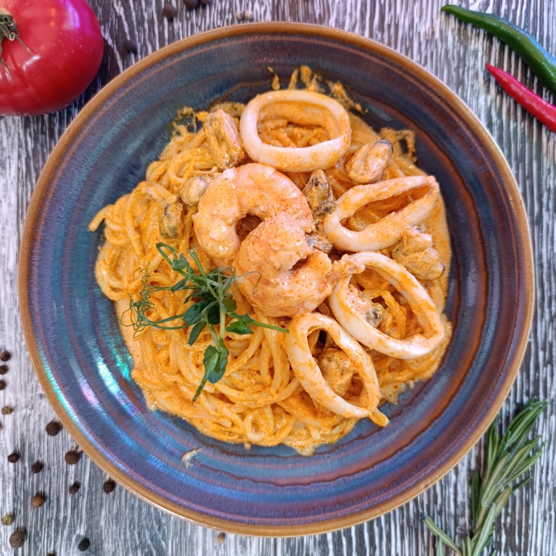спагетти, цыпленок, сливки, шампиньоны, лук, соус соевый, пармезан, травы прованские