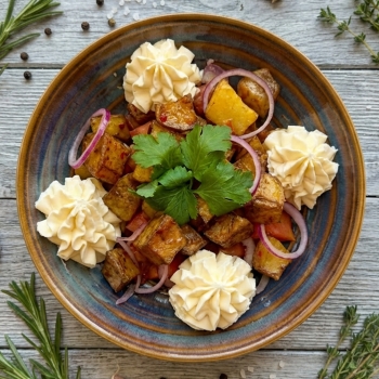 баклажаны, помидор, сыр сливочный, лук красный, соус сладкий чили, зелень