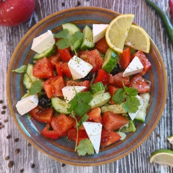 помидор, огурец, сыр фета, салат, маслины, лук красный, перец болгарский, лимон, масло оливковое, кинза, травы прованские