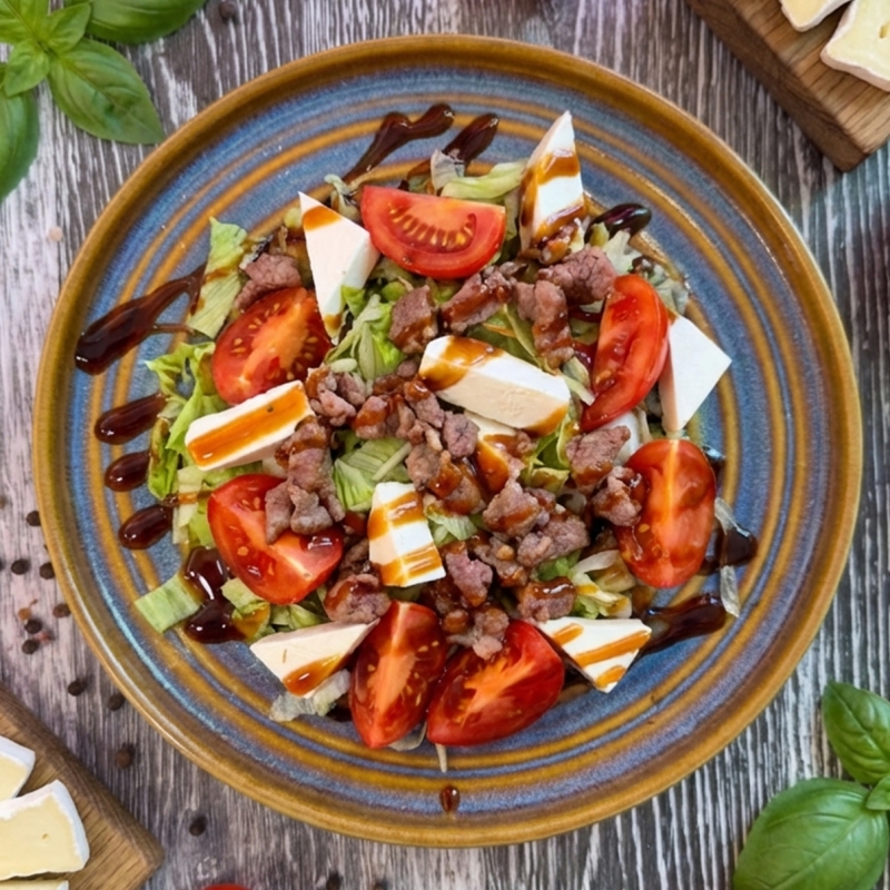 баклажаны, помидор, сыр сливочный, лук красный, соус сладкий чили, зелень