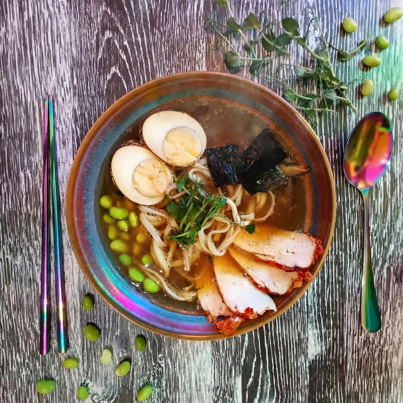 бульон куриный, лапша пшеничная, курица запеченая, яйцо, грибы шиитаке, бобы эдамаме, нори, зелень