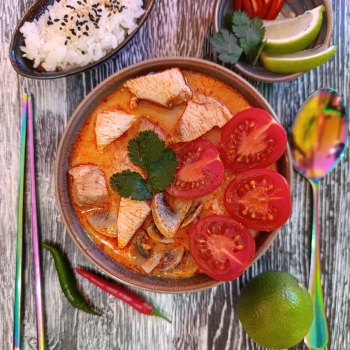 бульон том-ям, молоко кокосовое, сливки, креветки, семга, кальмар, мидии, черри, шампиньоны, перец чили, лемонграсс, лайм, рис, кинза
