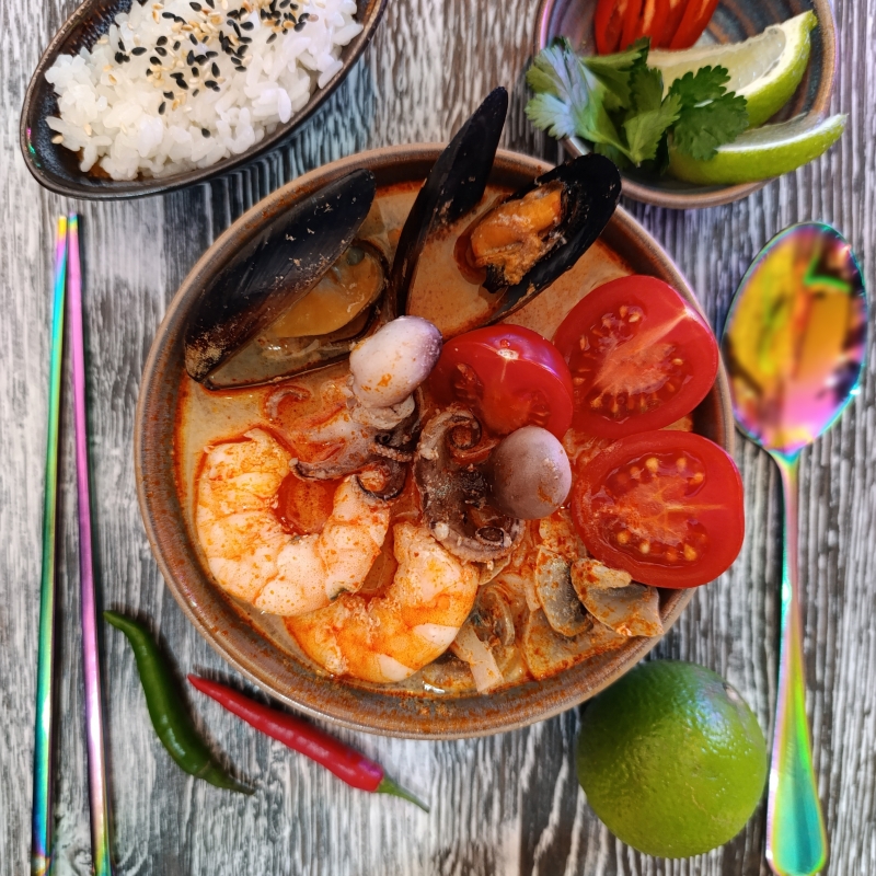 бульон том-ям, молоко кокосовое, сливки, креветки, семга, кальмар, мидии, черри, шампиньоны, перец чили, лемонграсс, лайм, рис, кинза