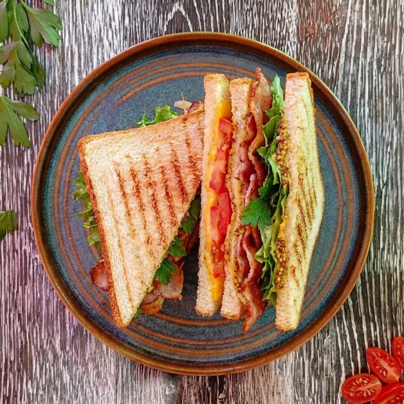 фирменная куриная котлета, бекон жареный, сыр чеддер двойной, салат, помидор, огурец соленый, лук красный, соус bbq, горчица